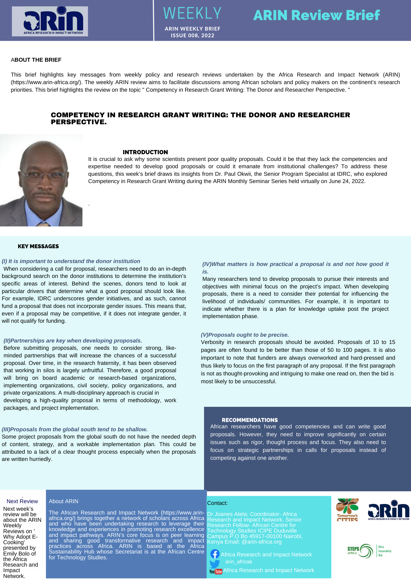 (https://www.arin-africa.org/). The weekly ARIN review aims to facilitate discussions among African scholars and policymakers on the continent’s research priorities. This brief highlights the review on the topic ” Competency in Research Grant Writing: The Donor and Researcher Perspective. “