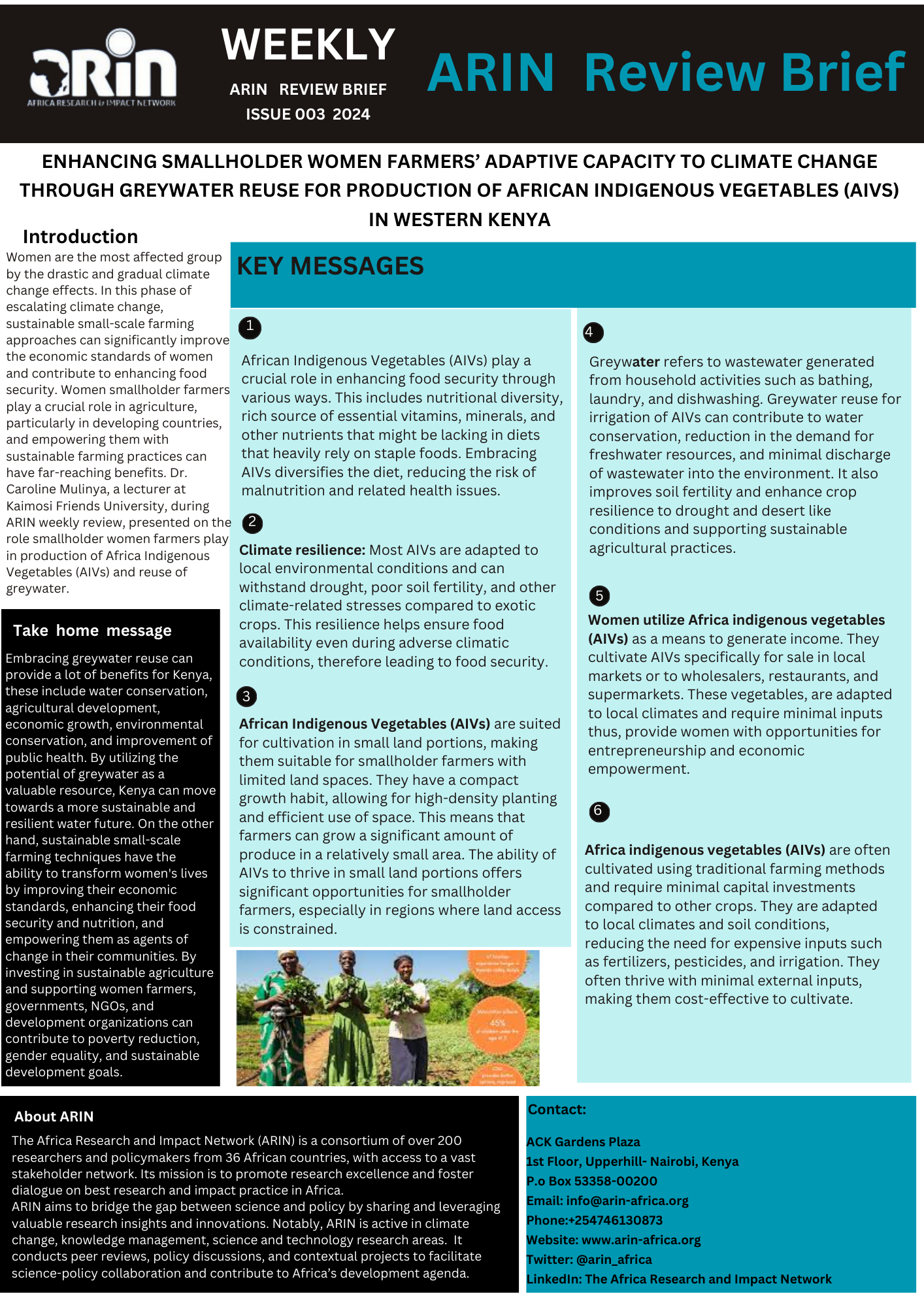 Women are the most affected group by the drastic and gradual climate change effects. In this phase of escalating climate change, sustainable small-scale farming approaches can significantly improve the economic standards of women and contribute to enhancing food security. Women smallholder farmers play a crucial role in agriculture, particularly in developing countries, and empowering them with sustainable farming practices can have far-reaching benefits. Dr. Caroline Mulinya, a lecturer at Kaimosi Friends University, during ARIN weekly review, presented on the role smallholder women farmers play in production of Africa Indigenous Vegetables (AIVs) and reuse of greywater.