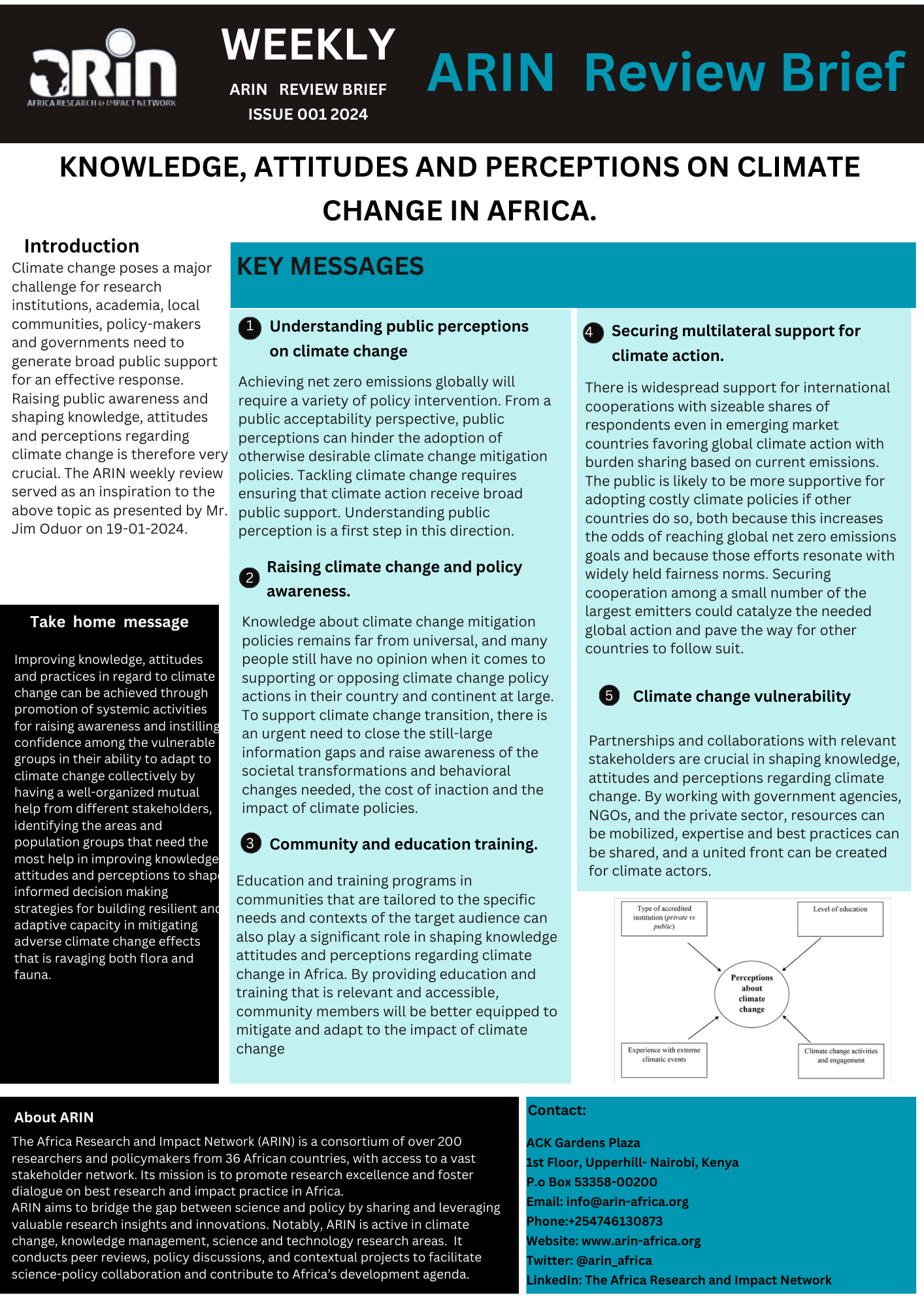 Climate change poses a major challenge for research institutions, academia, local communities, policy-makers and governments need to generate broad public support for an effective response. Raising public awareness and shaping knowledge, attitudes and perceptions regarding climate change is therefore very crucial. The ARIN weekly review served as an inspiration to the above topic as presented by Mr. Jim Oduor on 19-01-2024.