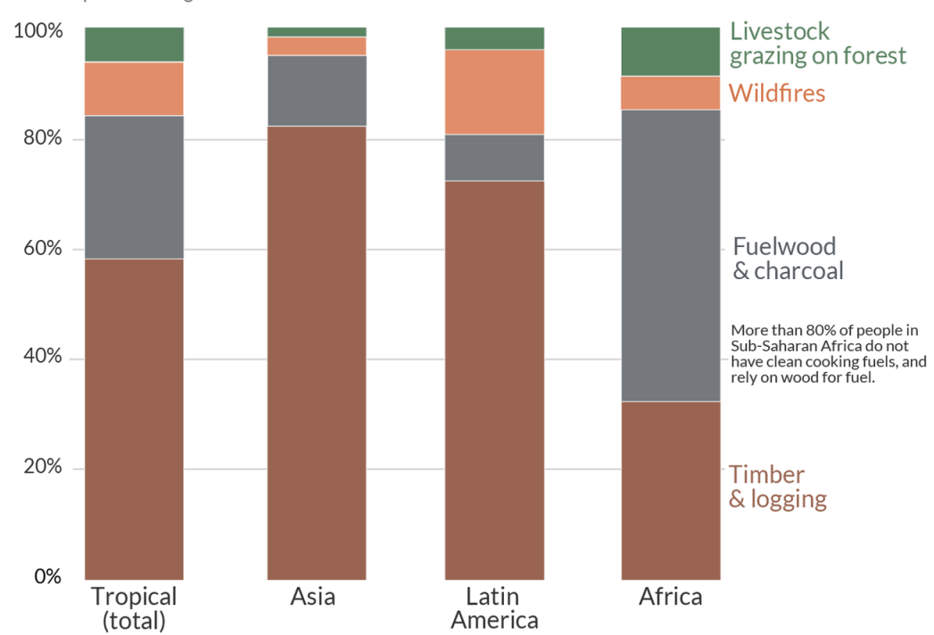 20% of the earth’s land is degraded; a phenomenon that aggravates climate change and drives the extinction of species. Human activity has been cited to be a major contributor to land degradation, drought, and desertification leading to reduced productivity of ecosystems. According to UN reports, 40% of the degraded land is attributed to human activities. While agricultural expansion is a key catalyst to deforestation, the use of traditional cooking methods plays a significant role as well (See Fig. 1). In Africa, the lack of clean cooking technologies presents itself as a major driver for deforestation. Approximately 47% of the trees harvested in Africa yearly are used at the household level as a source of biomass energy for cooking. This overreliance on solid biomass leads to the loss of biodiversity, which greatly affects ecosystem functions. For example, it is estimated that 50% of bird and mammal species in Africa will be lost due to land degradation. Given that human life is dependent on productive lands, halting land degradation is crucial if the earth’s biodiversity is to be enhanced, ecosystem services restored, and climate change impacts mitigated. This aligns with the theme for this year’s World Environment Day which focuses on “Land restoration, desertification, and drought resilience.”
