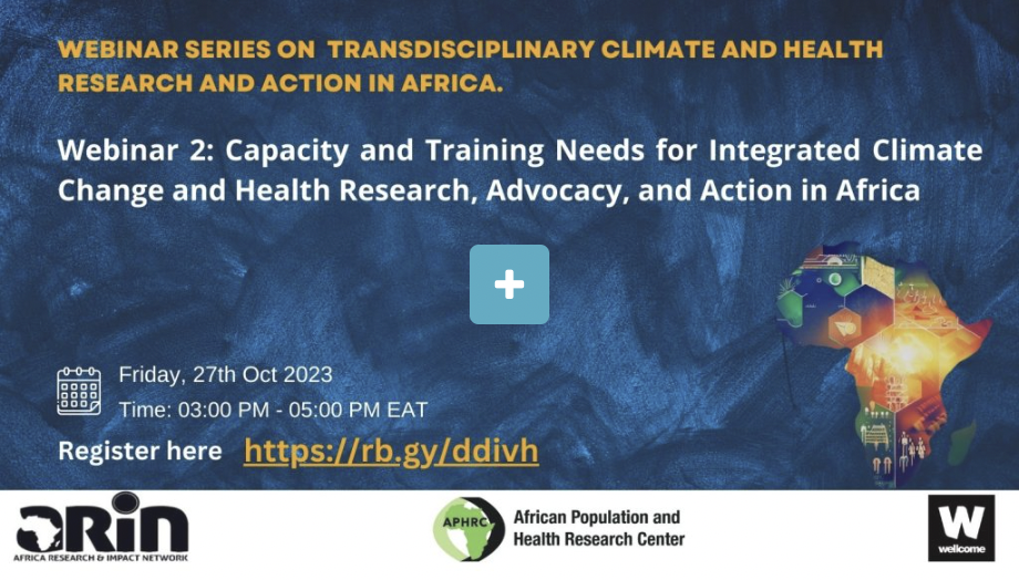 To accelerate efforts in addressing climate change and health, it is imperative to devote dedicated resources to enhancing the capacity and skills required to generate evidence and develop programs and policies that effectively address the interconnected challenges of climate change and health. This webinar, therefore, centres on the topic of Capacity and Training Needs for integrated Climate Change and Health research, advocacy, and action in Africa, scheduled for October 27, 2023, from 3:00 to 4:30 PM EAT. The webinar forms a part of a series entitled ‘Enabling Transdisciplinary Research and Action in Health and Climate Change in Africa,’ which contributes to Wellcome-funded consultations on Transdisciplinary Research and Action in Health and Climate Change in Africa. These consultations involve the integration of knowledge from various scientific disciplines and non-academic stakeholder communities.
