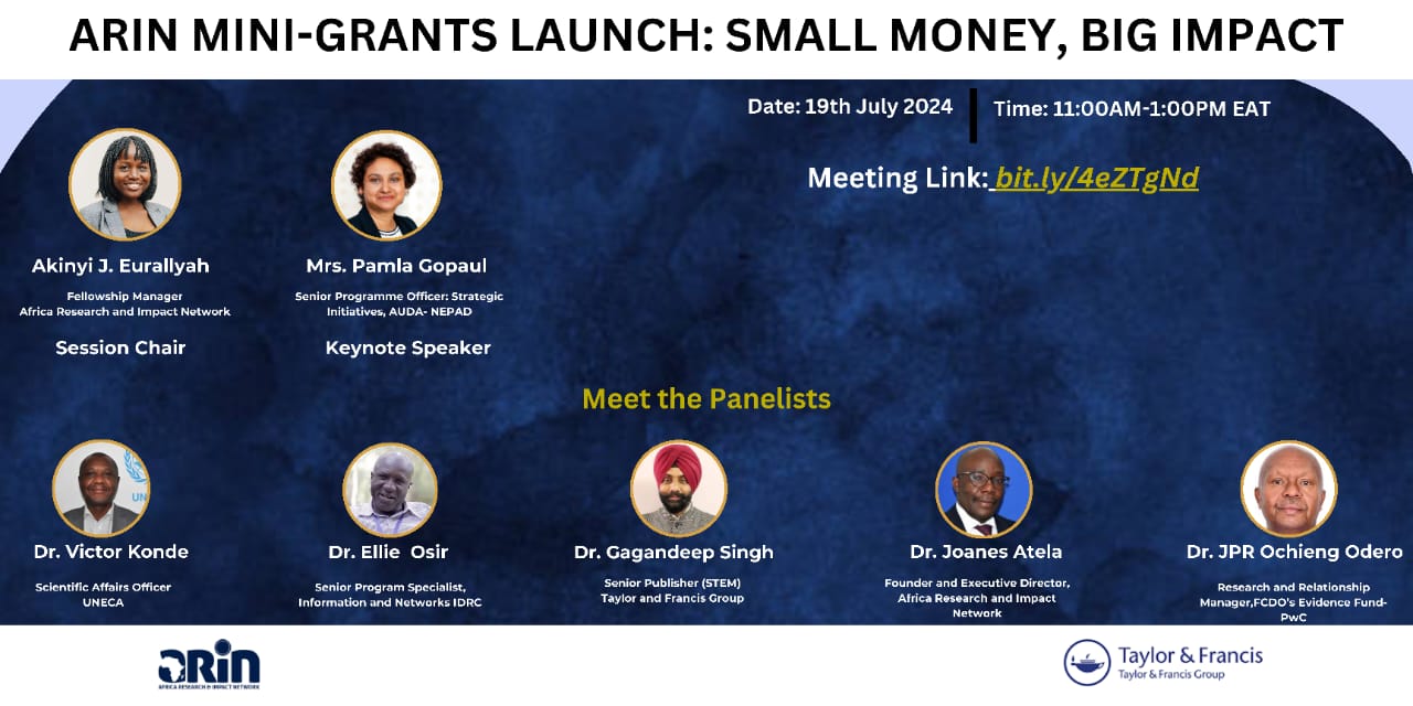 The launch of the ARIN Science-Policy Mini-grants and Mentorship Scheme, along with the virtual signing of the Memorandum of Understanding (MOU) between The Africa Research and Impact Network (ARIN) and Taylor and Francis (TF), was held virtually on 19th July 2024. The event attracted over one hundred participants from a diverse range of participants, including researchers, policy makers, and students.