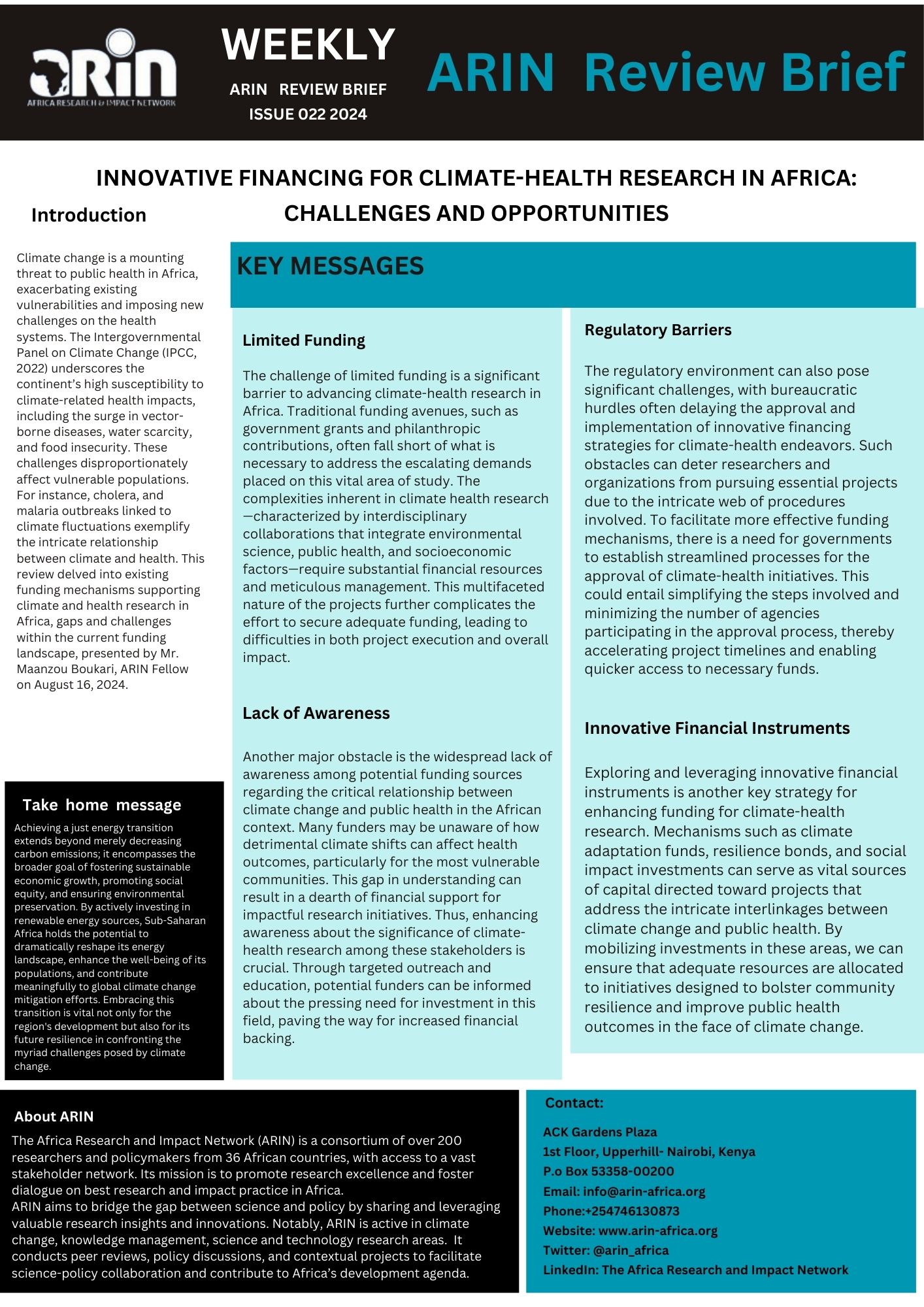 Climate change is a mounting threat to public health in Africa, exacerbating existing vulnerabilities and imposing new challenges on the health systems. The Intergovernmental Panel on Climate Change (IPCC, 2022) underscores the continent’s high susceptibility to climate-related health impacts, including the surge in vector-borne diseases, water scarcity, and food insecurity. These challenges disproportionately affect vulnerable populations. For instance, cholera, and malaria outbreaks linked to climate fluctuations exemplify the intricate relationship between climate and health. This review delved into existing funding mechanisms supporting climate and health research in Africa, gaps and challenges within the current funding landscape, presented by Mr. Maanzou Boukari, ARIN Fellow on August 16, 2024.
