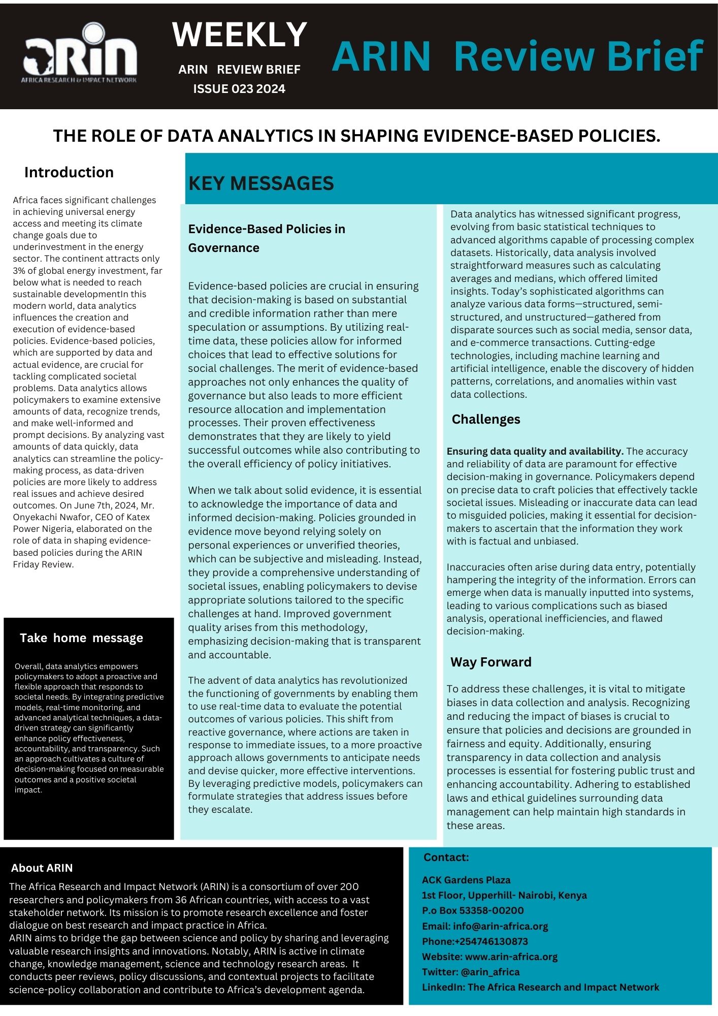 In this modern world, data analytics influences the creation and execution of evidence-based policies. Evidence-based policies, which are supported by data and actual evidence, are crucial for tackling complicated societal problems. Data analytics allows policymakers to examine extensive amounts of data, recognize trends, and make well-informed and prompt decisions. By analyzing vast amounts of data quickly, data analytics can streamline the policy-making process, as data-driven policies are more likely to address real issues and achieve desired outcomes. On June 7th, 2024, Mr. Onyekachi Nwafor, CEO of Katex Power Nigeria, elaborated on the role of data in shaping evidence-based policies during the ARIN Friday Review.