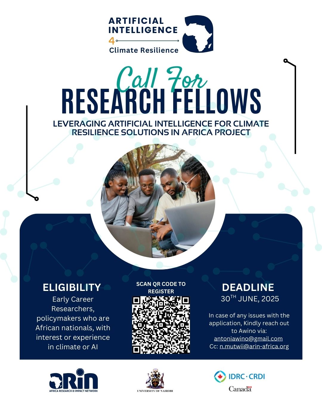 The Leveraging Artificial Intelligence (AI) for Climate Resilience Solutions in Africa project, spearheaded by the Africa Research and Impact Network (ARIN) in collaboration with the University of Nairobi and other ARUA centers and funded by the International Development Research Centre(IDRC),aims to explore AI’s role in fostering climate-resilient systems in Africa. The project seeks to: