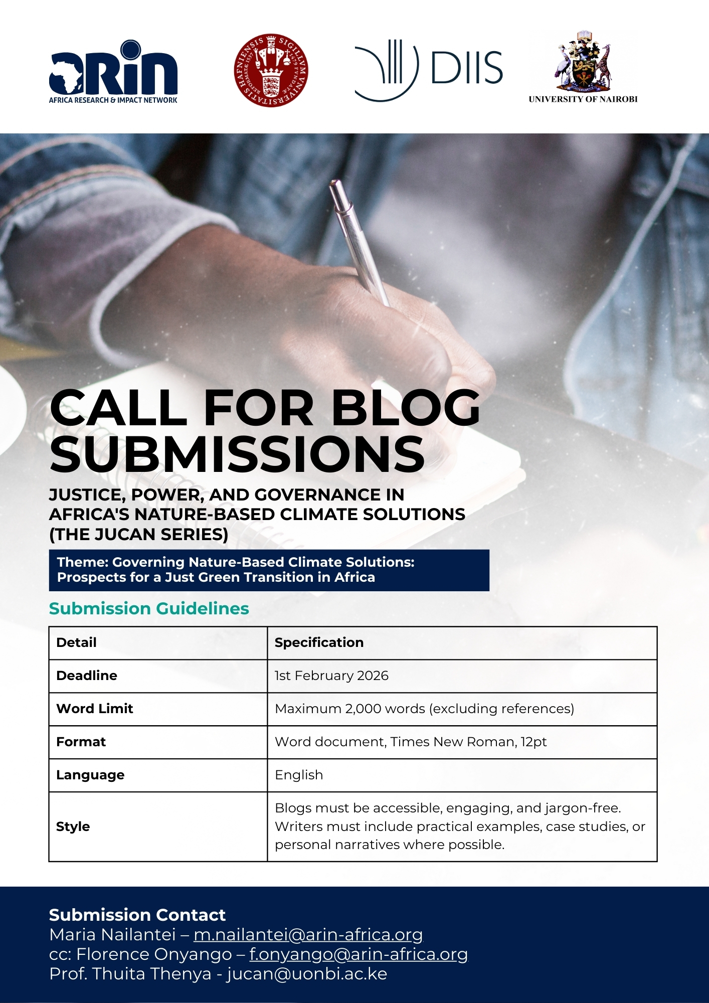The Justice, Carbon, Nature (JUCAN) project (https://jucan.uonbi.ac.ke/), led by the University of Copenhagen (UCPH) in collaboration with the University of Nairobi (UoN), the Danish Institute for International Studies (DIIS), and the Africa Research and Impact Network (ARIN), invites submissions for a special blog series.